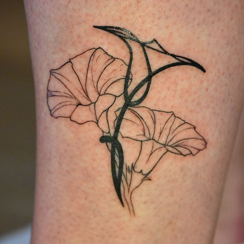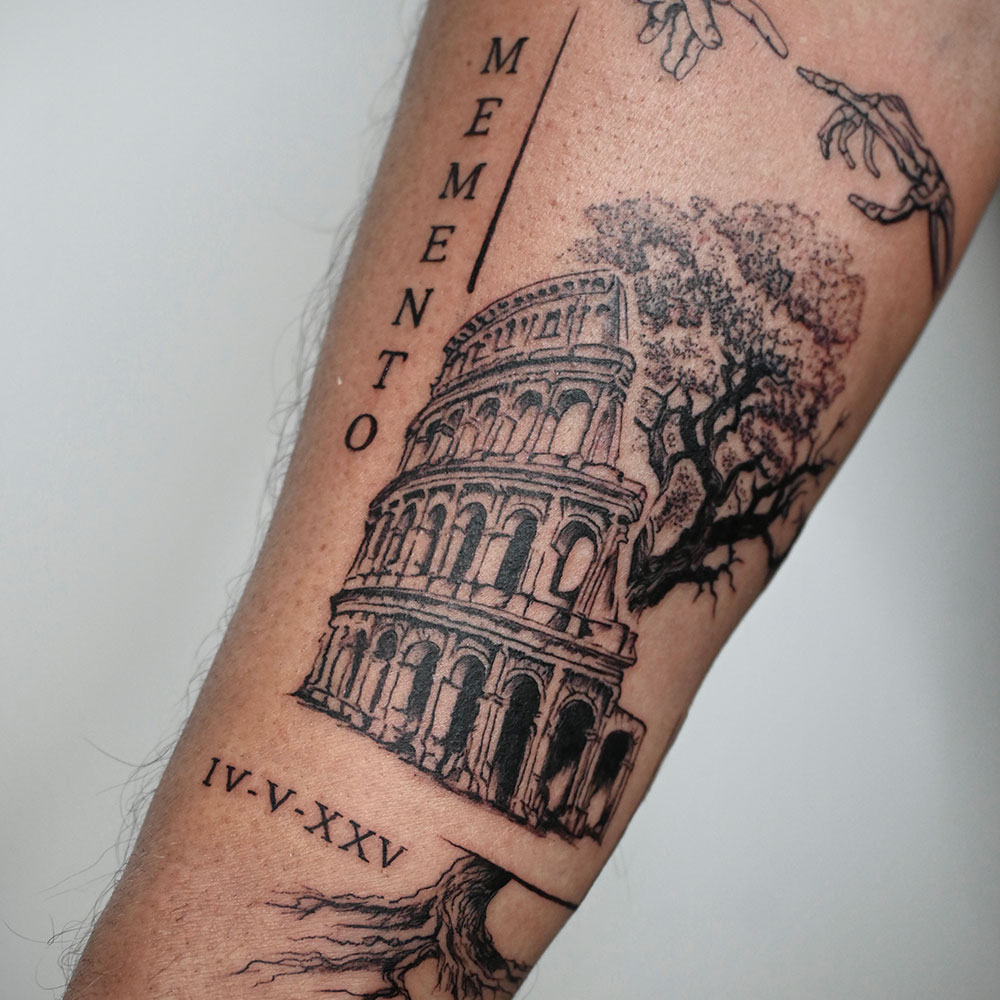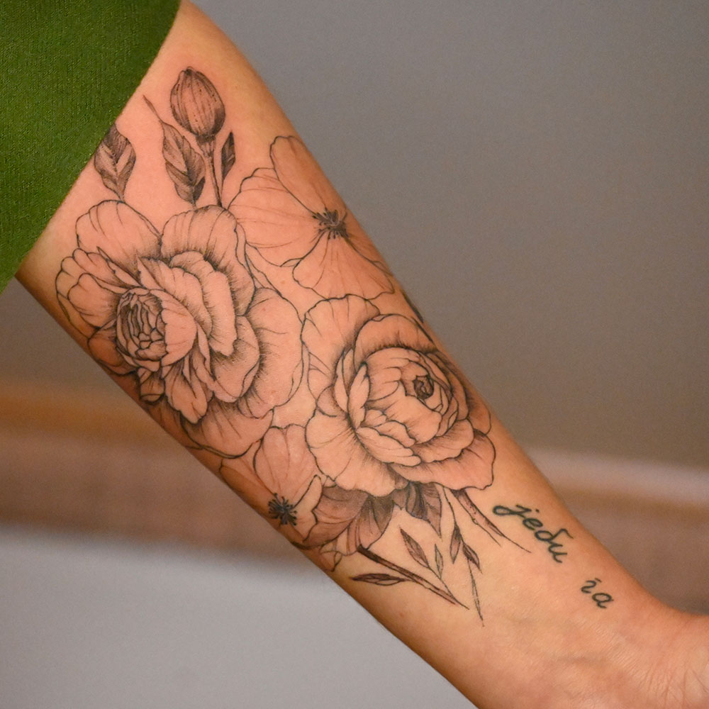 Mes inspirations artistiques sont très larges, de l’architecture au floral, en passant par le travail des textures. J’aime le travail du noir et des contrastes pour donner de la profondeur à chaque tatouage.